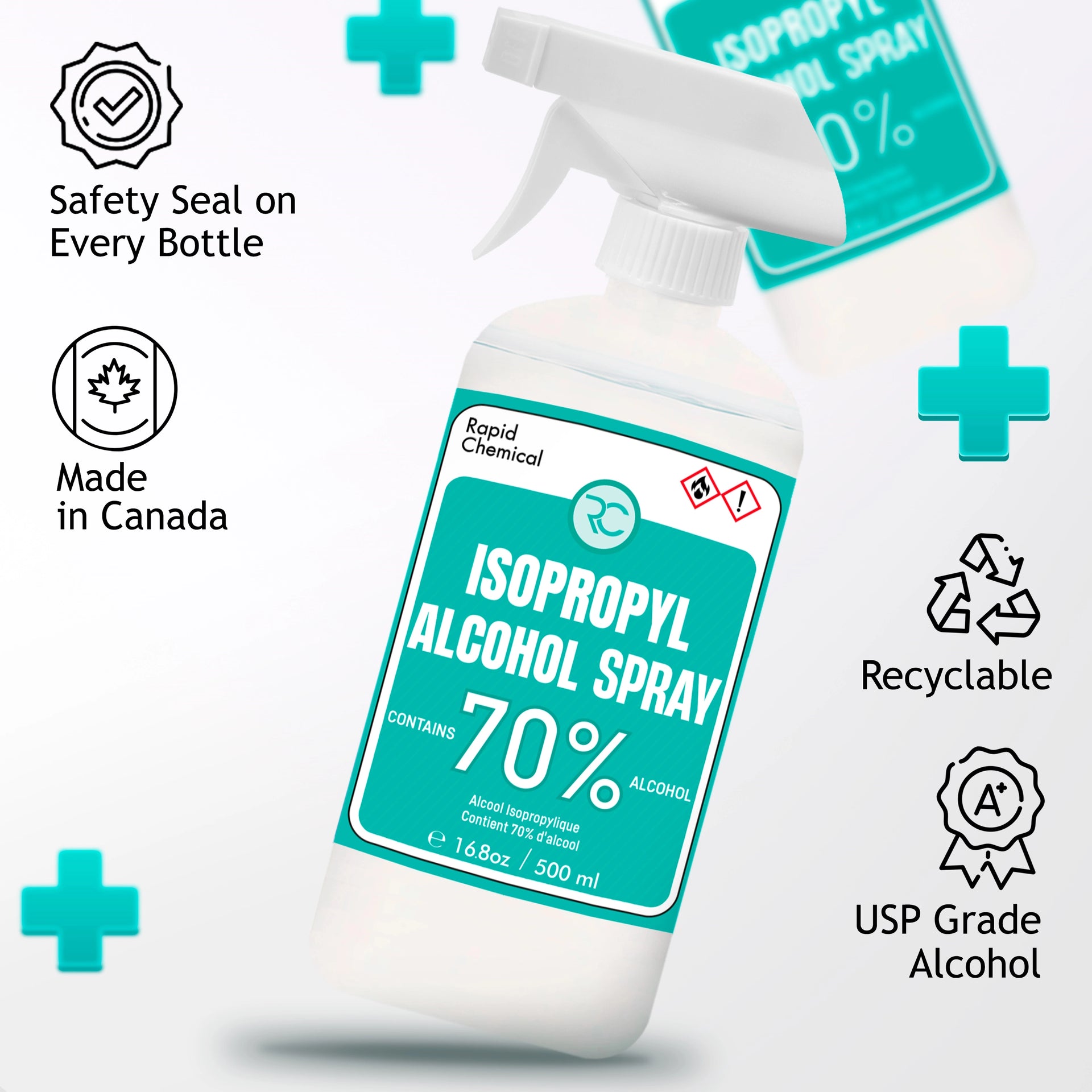 70% isopropyl alcohol spray (500ml), USP grade, safety seal, made in Canada.