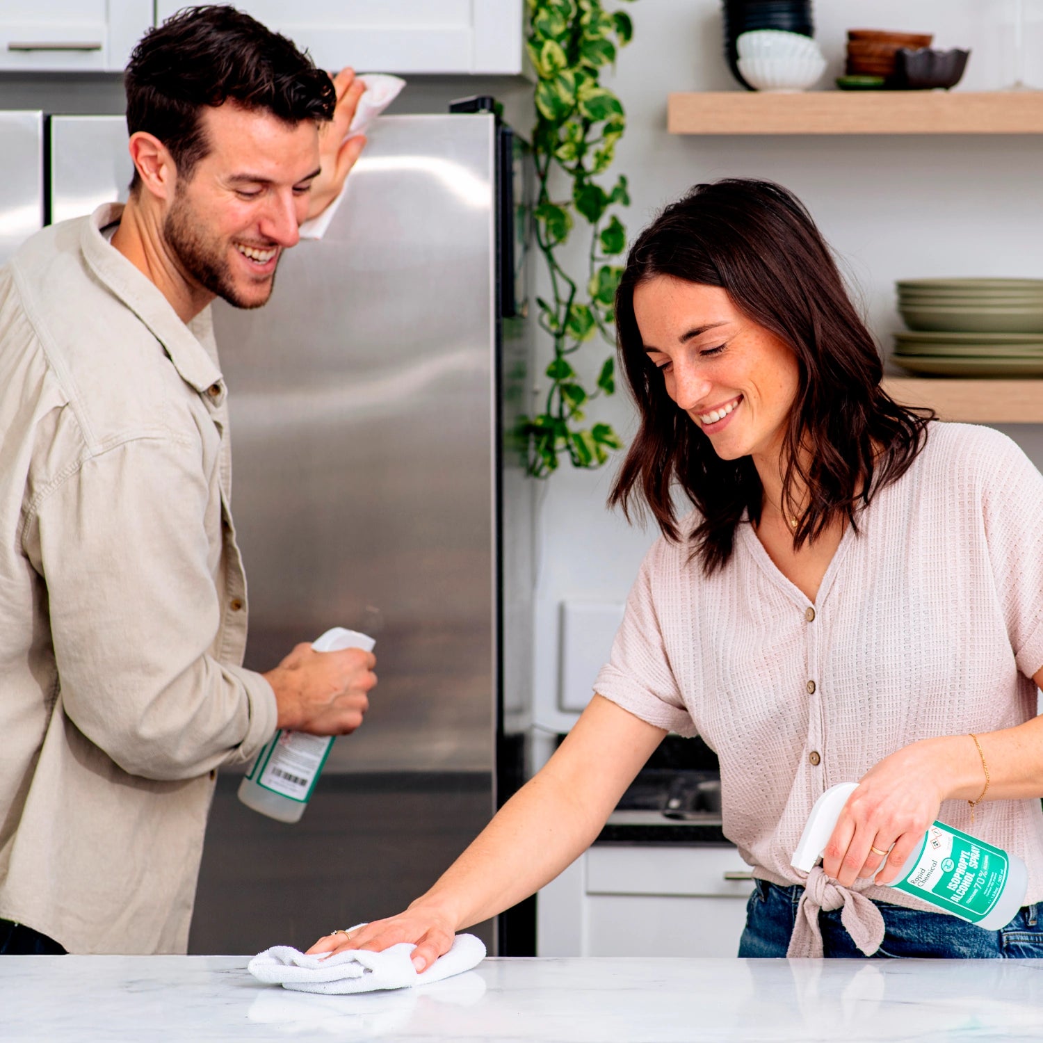 Man and woman cleaning kitchen surfaces with Rapid Protectant 75% alcohol spray